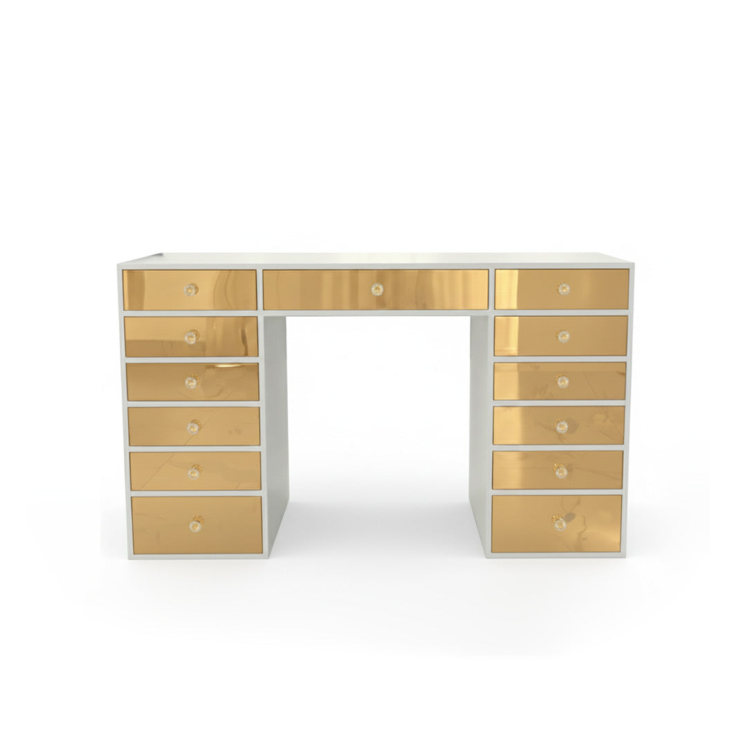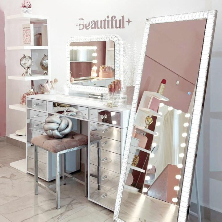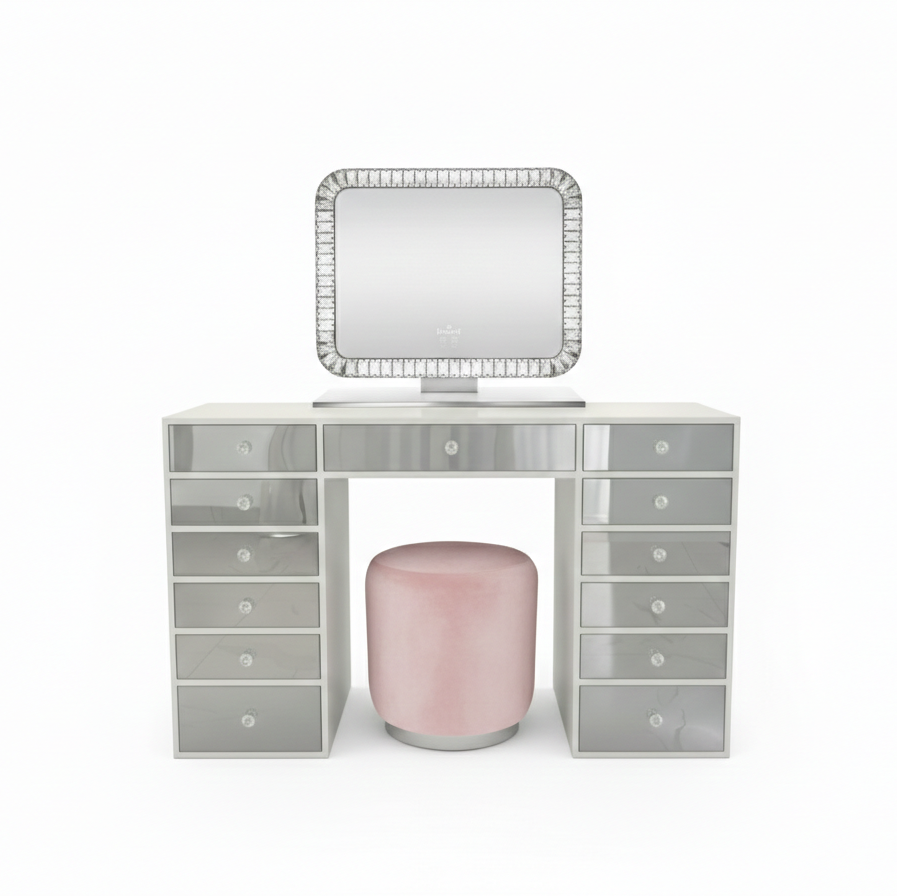 Descubre el Kit de Vanity Silver, la combinación perfecta de elegancia y funcionalidad. ✨ Incluye el Vanity Silver, con un impresionante efecto espejo en todos sus cajones, el Espejo Emily de la exclusiva línea Diamond y el Taburete Eli en un delicado tono rosa bajito. 💖 Un set diseñado para hacer de tu espacio un lugar único y sofisticado. ¡Hazlo tuyo hoy! ✨